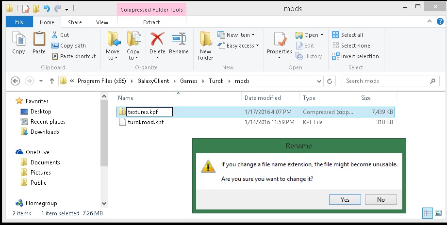 Step 7: Take that zipped folder and place it into your mods folder and rename it to textures.kpf. You can name your kpf however you wish as long as the textures folder is inside named correctly and your kpf is in the mods folder.