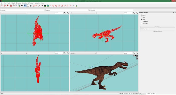 Since we did exportanimobj we will have access to the model as a hole. This time we will show the example in misfit 3d modeler and use the raptor instead of the knife just for fun.