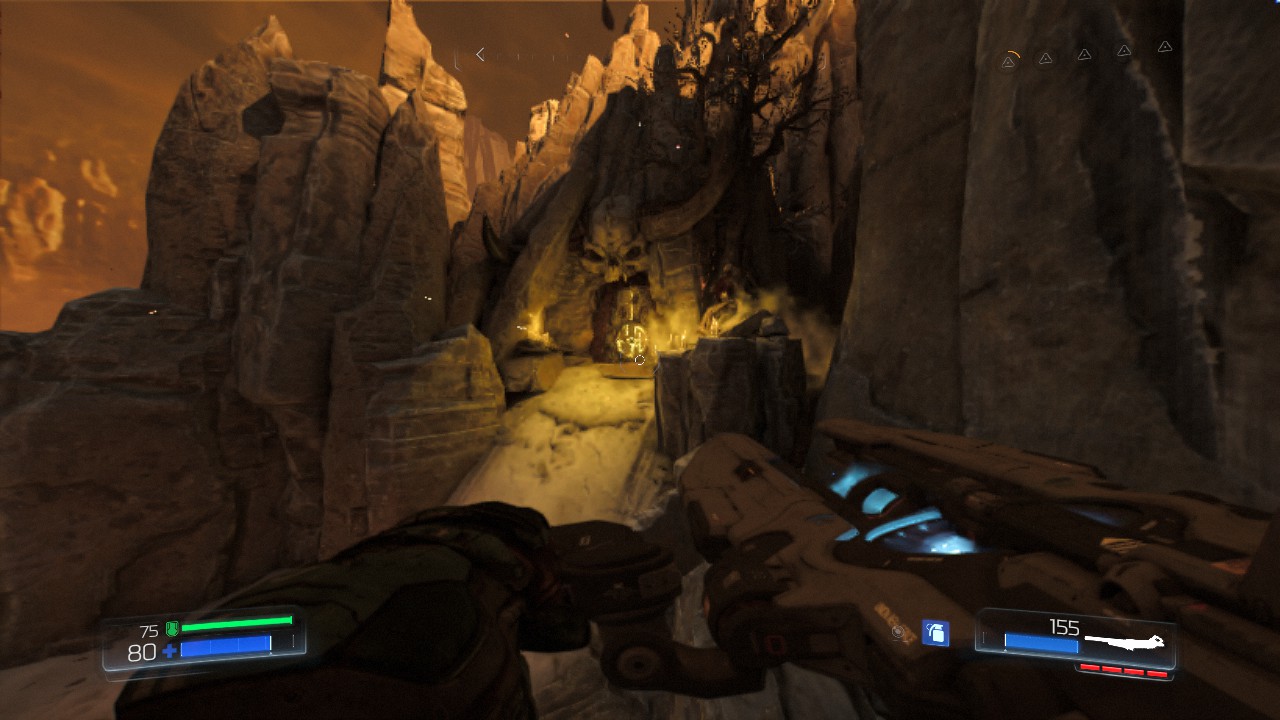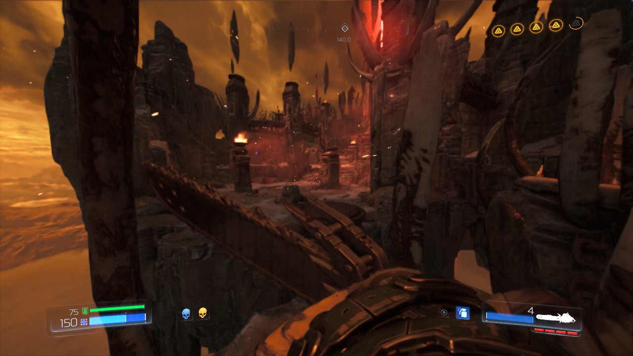 When I think of the level design it reminds me more of a classic layout. The exploration is tremendous and the amount of places you can reach is pretty amazing not to mention rewarding. They have backtracking and all the stuff that is fun to me in a classic fps almost. There is different types of levels of course like the UAC levels. Those seem to have have multiple types of sci-fi interiors as you reach different levels of the base. Then there is the Mars levels which are probably the most explorative. There very open and have many ledges, cliffs, and secrets. But nothing compares to the hell levels. Not even close, this type of art in the hell levels is beyond amazing. This could be a movie scene in hell and just combine it with fast paced action of Doom! I have never seen such a well designed hell. It makes you want to pay a visit to hell slay all the demons look at some of the scenery and do it again rather quickly. Sometimes I didn’t want to proceed in the levels because they looked to artistic to just move on for me. I got to play some of the game with my wife watching and even she was surprised by some of the things we saw. She felt like she was watching a horror movie but she was just watching me play Doom! Its safe to say the art, layout, and placement of the levels is more then spot on. The hell levels are super iconic and I have never seen anything quite like it. I don’t think I could even explain how much I liked the hell levels. Its not only hell though in all locations the Doom or horror wasn’t cut short from it some of the sci-fi levels were very fabulous to. It was kind of cool to return back to mars after the demons have already been there. Everything is a bit different when you return lots of dark horror themes. But once you see these hell levels its hard to look at anything and measure it to that. I suppose by switching atmospheres it keeps the other fresh but I feel I could play an entire game based in the hell levels like this. They sure did capture there own style with these and its perfect. They should make an expansion story game and base it all in hell! I bet it would be great. Here in these levels even screenshots become art.