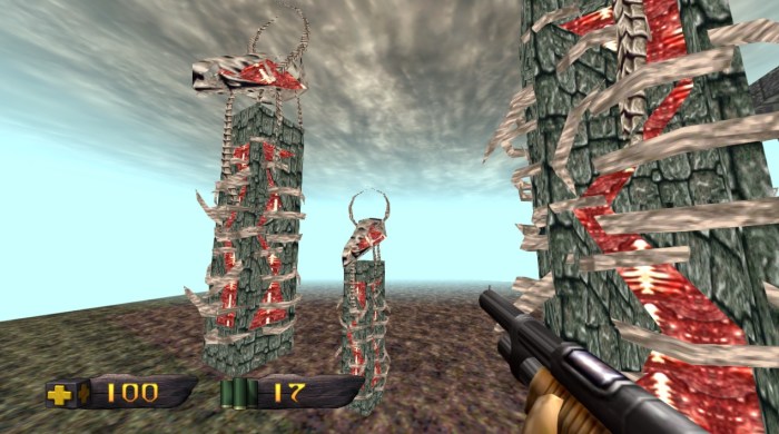 In this one I have added some Turok models into the mix. I have used the Trex and the Human skulls on top there obviously. I also used Turok 1 and Turok 2 textures in these. Which I think is the way to go! No there’s no Doom esque going on here lol.